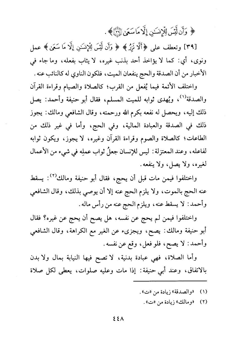 [39] وتعطف على {أَلَّا تَزِرُ} {وَأَنْ لَيْسَ لِلْإِنْسَانِ إِلَّا مَا سَعَى} عمل ونوى، أي: كما لا يؤاخذ أحد بذنب غيره، لا يثاب بفعله، وما جاء في الأخبار من أن الصدقة والحج ينفعان الميت، فلكون الناوي له كالنائب عنه.