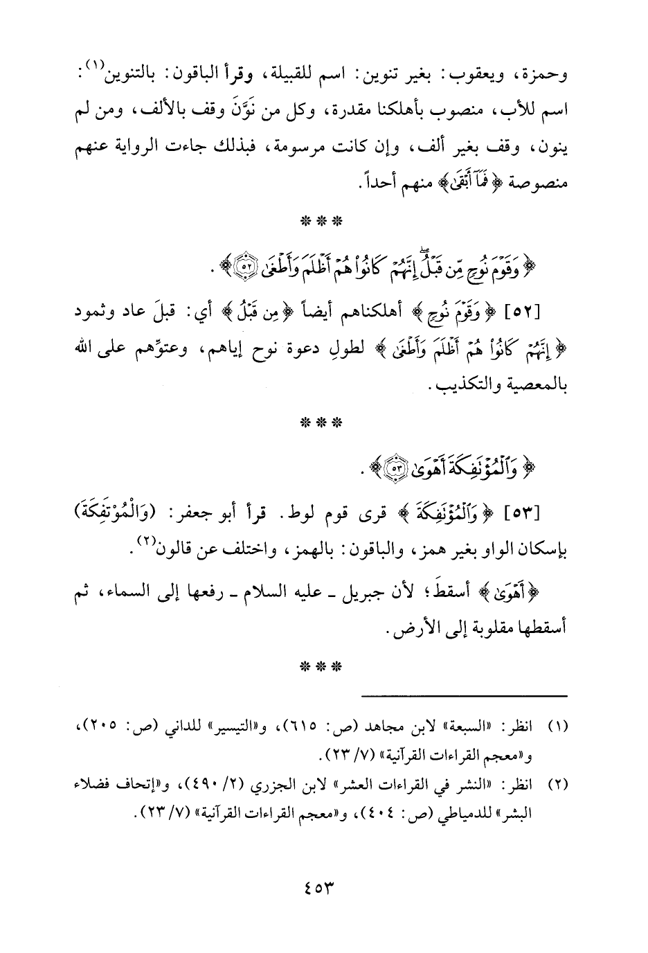 [53] {وَالْمُؤْتَفِكَةَ} قرى قوم لوط. قرأ أبو جعفر: (والْمُوْتَفِكَةَ) بإسكان الواو بغير همز، والباقون: بالهمز، واختلف عن قالون (¬2).