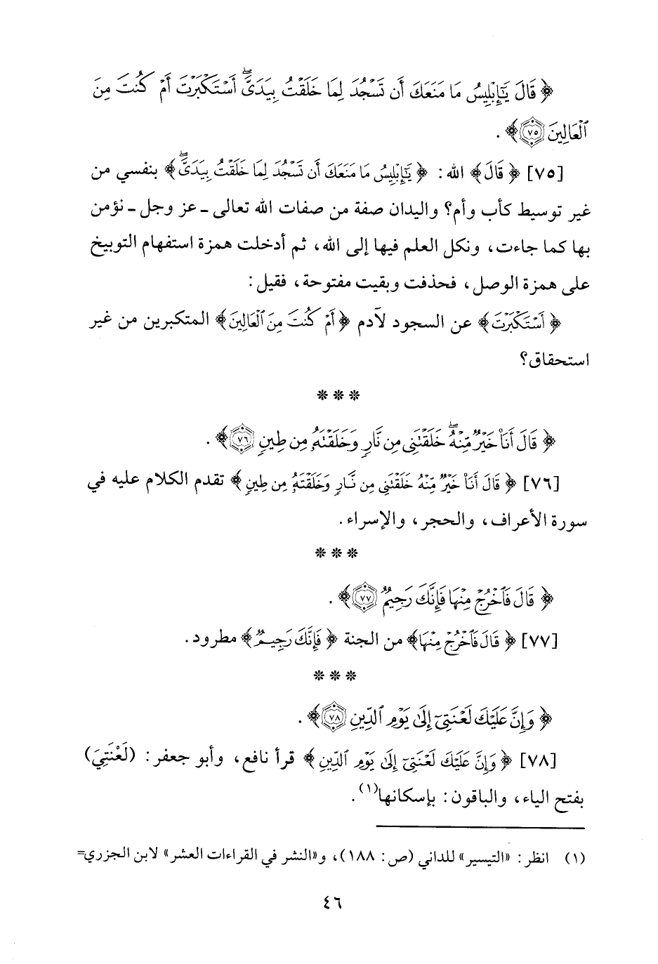 [76] {قَالَ أَنَا خَيْرٌ مِنْهُ خَلَقْتَنِي مِنْ نَارٍ وَخَلَقْتَهُ مِنْ طِينٍ} تقدم الكلام عليه في سورة الأعراف، والحجر، والإسراء.