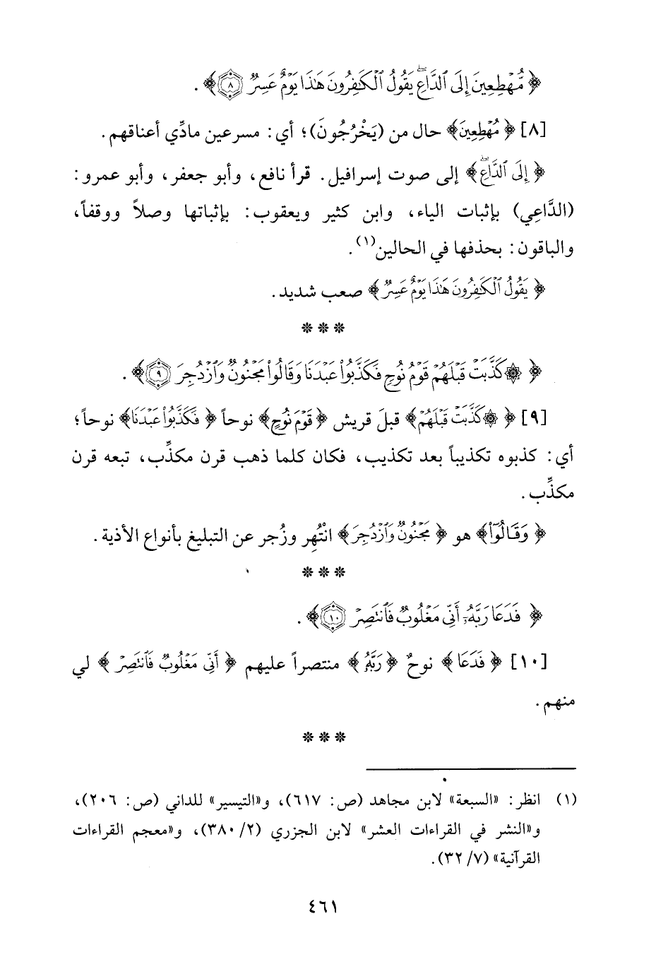 [8] {مُهْطِعِينَ} حال من (يَخْرُجُونَ)؛ أي: مسرعين مادِّي أعناقهم.