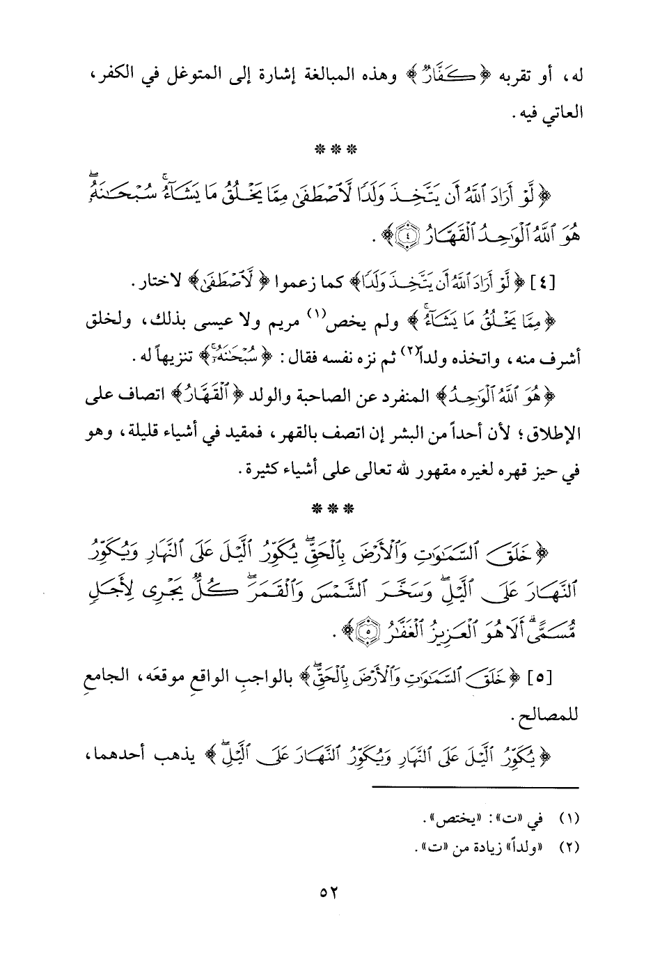 [5] {خَلَقَ السَّمَاوَاتِ وَالْأَرْضَ بِالْحَقِّ} بالواجبِ الواقعِ موقعَه، الجامعِ للمصالح.