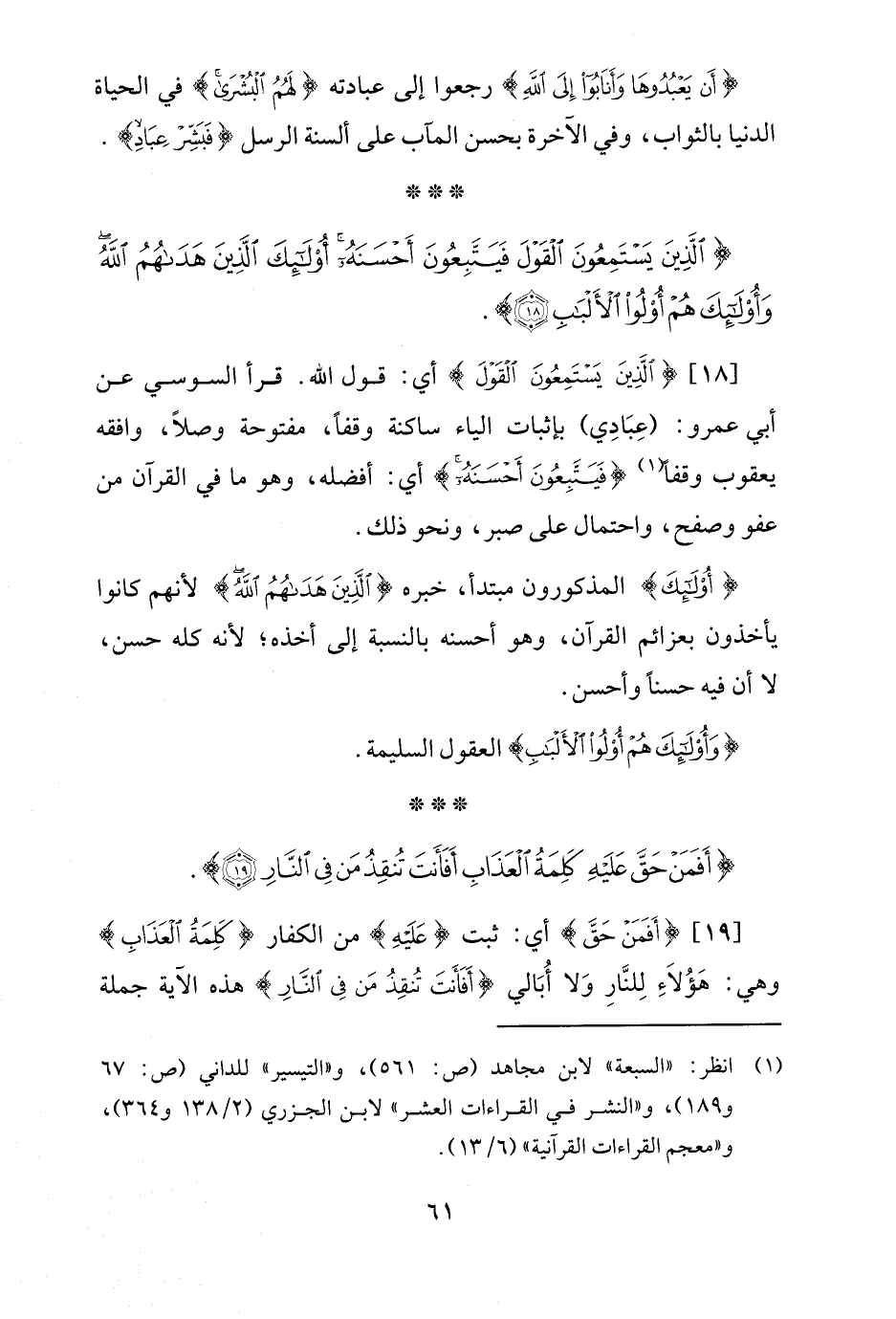 [18] {الَّذِينَ يَسْتَمِعُونَ الْقَوْلَ} أي: قول الله. قرأ السوسي عن أبي عمرو: (عِبَادِي) بإثبات الياء ساكنة وقفًا، مفتوحة وصلًا، وافقه يعقوب وقفًا (¬1) {فَيَتَّبِعُونَ أَحْسَنَهُ} أي: أفضله، وهو ما في القرآن من عفو وصفح، واحتمال على صبر، ونحو ذلك.