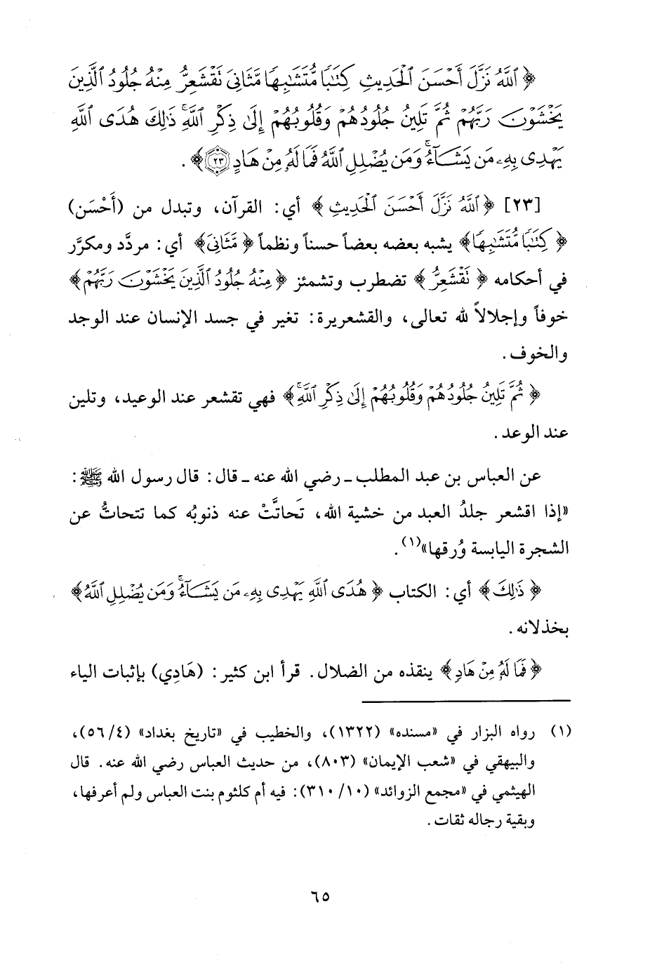 [23] {اللَّهُ نَزَّلَ أَحْسَنَ الْحَدِيثِ} أي: القرآن، وتبدل من (أَحْسَن) {كِتَابًا مُتَشَابِهًا} يشبه بعضه بعضًا حسنًا ونظمًا {مَثَانِيَ} أي: مردَّد ومكرَّر في أحكامه {تَقْشَعِرُّ} تضطرب وتشمئز {مِنْهُ جُلُودُ الَّذِينَ يَخْشَوْنَ رَبَّهُمْ} خوفًا وإجلالًا لله تعالى، والقشعريرة: تغير في جسد الإنسان عند الوجد والخوف.
