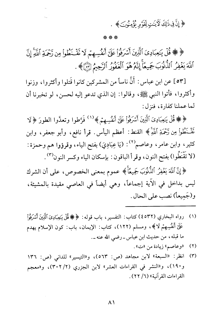 [53] عن ابن عباس: أَنَّ ناسًا من المشركين كانوا قَتلوا وأكثروا، وزنوا وأكثروا، فأتوا النبي - صلى الله عليه وسلم -، وقالوا: إن الذي تدعو إليه لحسن، لو تخبرنا أن لما عملنا كفارة، فنزل: