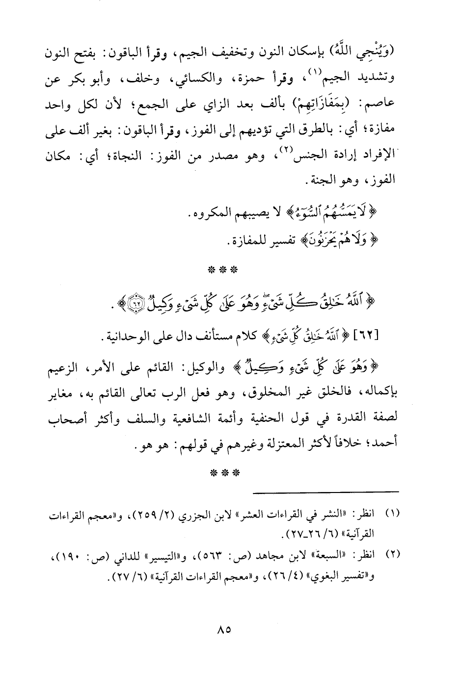 (وَيُنْجِي اللَّهُ) بإسكان النون وتخفيف الجيم، وقرأ الباقون: بفتح النون وتشديد الجيم (¬1)، وقرأ حمزة، والكسائي، وخلف، وأبو بكر عن عاصم: (بِمَفَازَاتِهِمْ) بألف بعد الزاي على الجمع؛ لأن لكل واحد مفازة؛ أي: بالطرق التي تؤديهم إلى الفوز، وقرأ الباقون: بغير ألف على الإفراد إرادة الجنس (¬2)، وهو مصدر من الفوز: النجاة؛ أي: مكان الفوز، وهو الجنة.