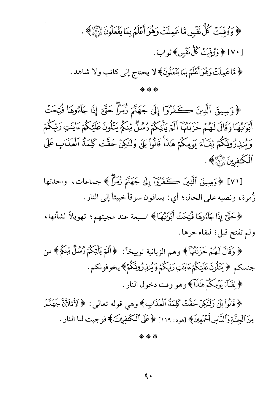 [71] {وَسِيقَ الَّذِينَ كَفَرُوا إِلَى جَهَنَّمَ زُمَرًا} جماعات، واحدتها زُمرة، ونصبه على الحال؛ أي: يساقون سوقًا خبيثًا إلى النار.