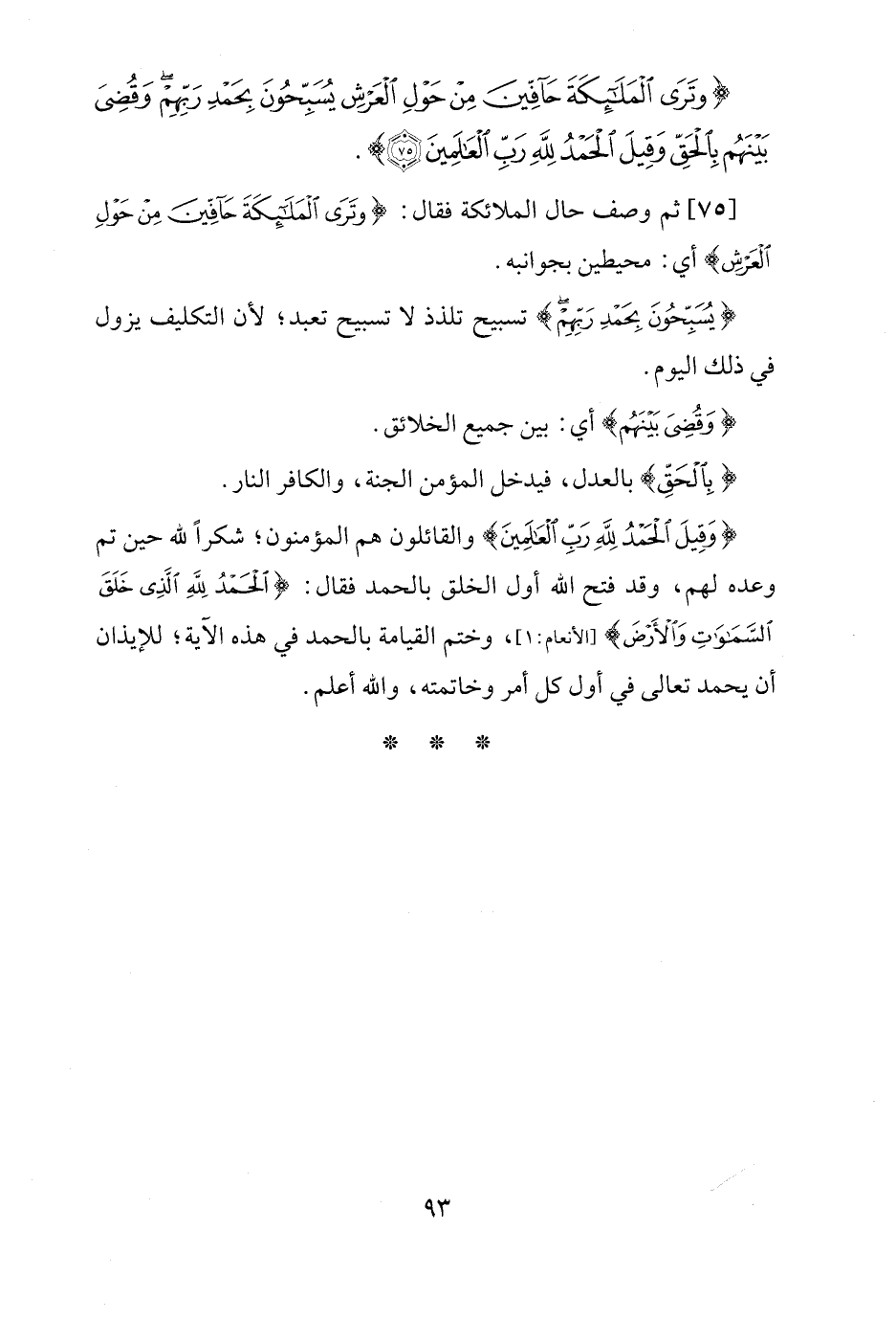 [75] ثم وصف حال الملائكة فقال: {وَتَرَى الْمَلَائِكَةَ حَافِّينَ مِنْ حَوْلِ الْعَرْشِ} أي: محيطين بجوانبه.