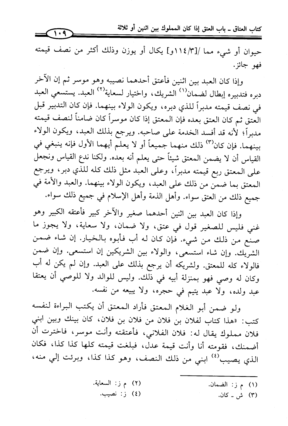 ولو ضمن أبو الغلام المعتق فأراد المعتق أن يكتب البراءة لنفسه كتب: "هذا كتاب لفلان بن فلان من فلان بن فلان، كان بينك وبين ابني فلان مملوك يقال له: فلان الفلاني، فأعتقته وأنت موسر، فاخترت أن أضمنك، فقومته أنا وأنت قيمة عدل، فبلغت قيمته كلها كذا كذا، فكان الذي يصيب (¬4) ابني من ذلك النصف، وهو كذا كذا، وبرئت إلي منه،
