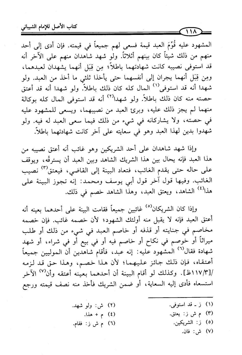 المشهود عليه قُوّمَ العبد قيمة فسعى لهم جميعاً في قيمته. فإن أدى إلى أحد منهم من ذلك شيئاً كان بينهم أثلاثاً. ولو شهد شاهدان منهم على الآخر أنه قد استوفى نصيبه كانت شهادتهما باطلاً؛ مِن قِبَل أنهما يشهدان لعبدهما، ومِن قِبَل أنهما يجران إلى أنفسهما حتى يأخذا ثلثي ما أخذ من العبد. ولو شهدا أنه قد استوفى (¬1) المال كله كان ذلك باطلاً. ولو شهدا أنه قد أعتق حصته منه كان ذلك باطلاً. ولو شهدا (¬2) أنه قد استوفى المال كله بوكالة منهما لم يجز ذلك عليه، وبرئ العبد من نصيبهما، ويسعى للمشهود عليه في حصته، ولا يشاركانه في شيء من ذلك فيما سعى العبد له فيه. ولو شهدوا بدين لهذا العبد وهو في سعايته على آخر كانت شهادتهما باطلاً.