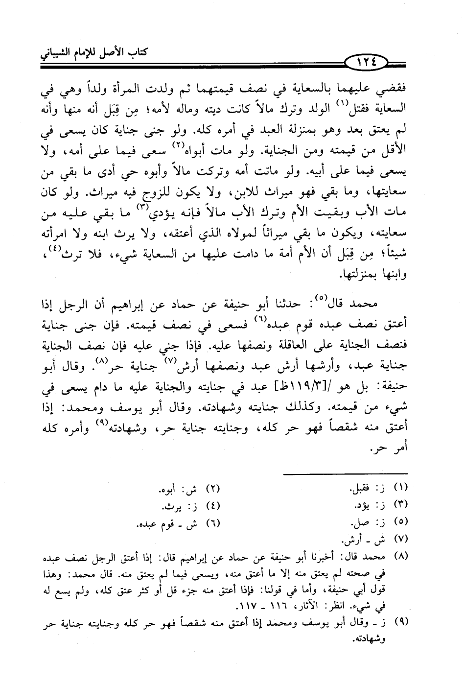 (¬8) محمد قال: أخبرنا أبو حنيفة عن حماد عن إبراهيم قال: إذا أعتق الرجل نصف عبده في صحته لم يعتق منه إلا ما أعتق منه، ويسعى فيما لم يعتق منه. قال محمد: وهذا قول أبي حنيفة، وأما في قولنا: فإذا أعتق منه جزء قل أو أكثر عتق كله، ولم يسع له في شيء. انظر: الآثار، 116 - 117.