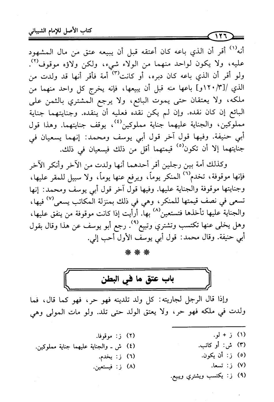 أنه (¬1) أقر أن الذي باعه كان أعتقه قبل أن يبيع عتق من مال المشهود عليه، ولا يكون لواحد منهما من الولاء شيء، ولكن ولاؤه موقوف (¬2). ولو أقر أن الذي باعه كان دبره، أو كانت (¬3) أمة فأقر أنها قد ولدت من الذي باعها منه قبل أن يبيعها، فإنه يخرج كل واحد منهما من ملكه، ولا يعتقان حتى يموت البائع، ولا يرجع المشتري بالثمن على البائع إن كان نقده. وإن لم يكن نقده فعليه أن ينقده. وجنايتهما جناية مملوكين، والجناية عليهما جناية مملوكين (¬4)، يوقف جنايتهما. وهذا قول أبي حنيفة. وفيها قول آخر قول أبي يوسف ومحمد: إنهما يسعيان في جنايتهما إلا أن تكون (¬5) قيمتهما أقل من ذلك فيسعيان في ذلك.