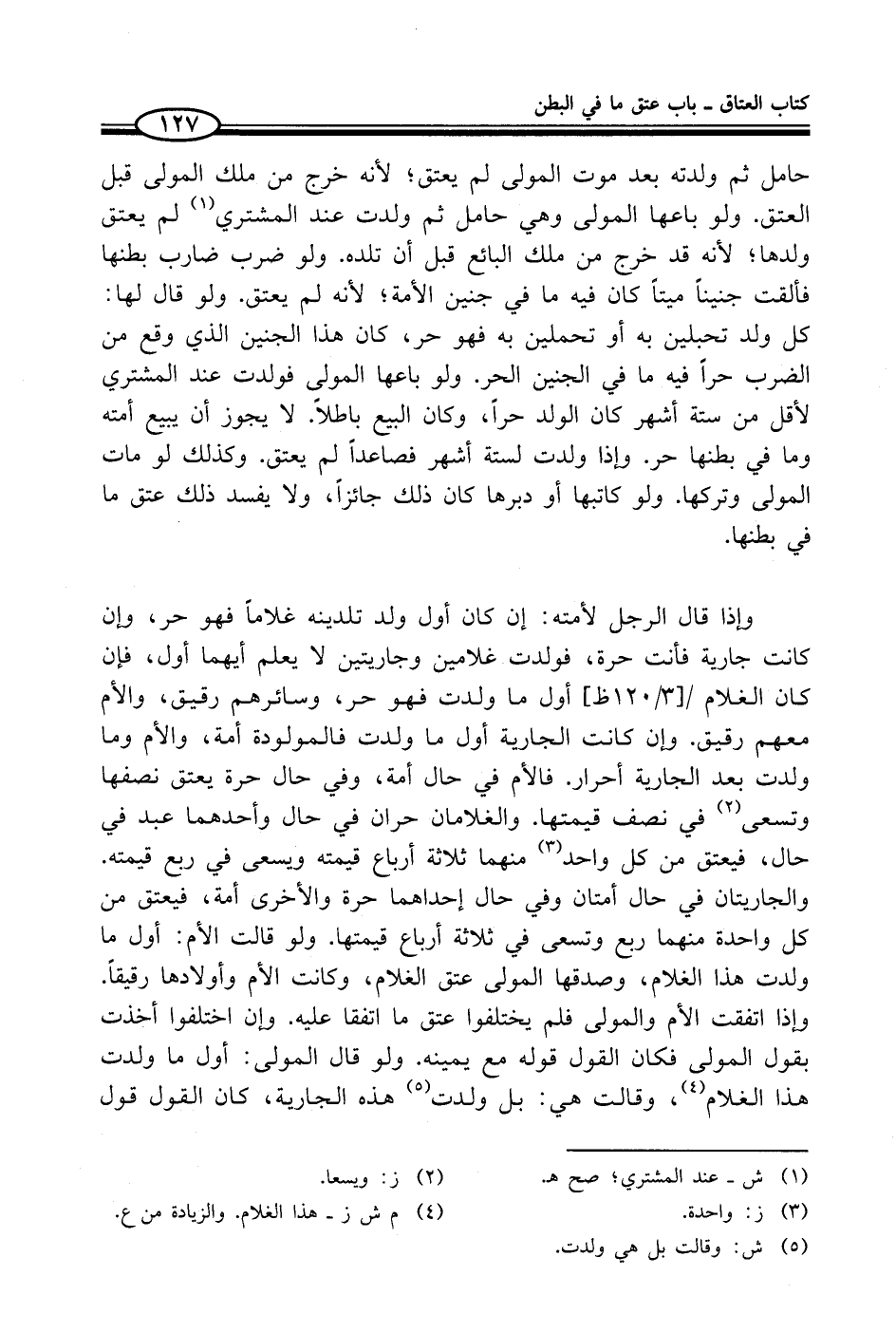 حامل ثم ولدته بعد موت المولى لم يعتق؛ لأنه خرج من ملك المولى قبل العتق. ولو باعها المولى وهي حامل ثم ولدت عند المشتري (¬1) لم يعتق ولدها؛ لأنه قد خرج من ملك البائع قبل أن تلده. ولو ضرب ضارب بطنها فألقت جنيناً ميتاً كان فيه ما في جنين الأمة؛ لأنه لم يعتق. ولو قال لها: كل ولد تحبلين به أو تحملين به فهو حر، كان هذا الجنين الذي وقع من الضرب حراً فيه ما في الجنين الحر. ولو باعها المولى فولدت عند المشتري لأقل من ستة أشهر كان الولد حراً، وكان البيع باطلاً. لا يجوز أن يبيع أمته وما في بطنها حر. وإذا ولدت لستة أشهر فصاعداً لم يعتق. وكذلك لو مات المولى وتركها. ولو كاتبها أو دبرها كان ذلك جائزاً، ولا يفسد ذلك عتق ما في بطنها.