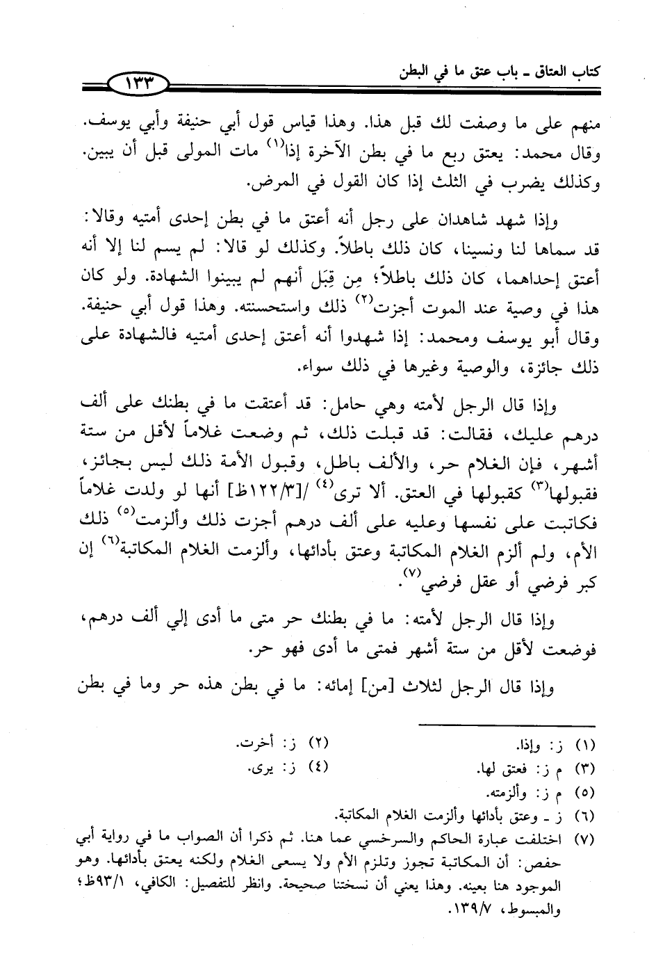 (¬7) اختلفت عبارة الحاكم والسرخسي عما هنا. ثم ذكرا أن الصواب ما في رواية أبي حفص: أن المكاتبة تجوز وتلزم الأم ولا يسعى الغلام ولكنه يعتق بأدائها. وهو الموجود هنا بعينه. وهذا يعني أن نسختنا صحيحة. وانظر للتفصيل: الكافي، 1/ 93 ظ؛ والمبسوط، 7/ 139.