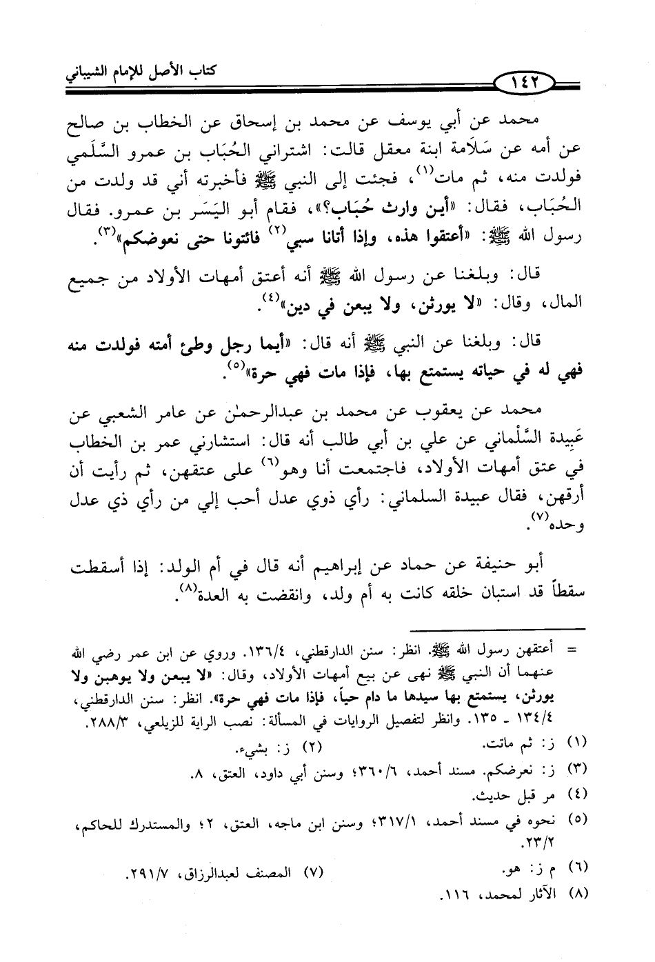 = أعتقهن رسول الله - صلى الله عليه وسلم -. انظر: سنن الدارقطني، 4/ 136. وروي عن ابن عمر - رضي الله عنهما - أن النبي - صلى الله عليه وسلم - نهى عن بيع أمهات الأولاد، وقال: "لا يبعن ولا يوهبن ولا يورثن، يستمتع بها سيدها ما دام حياً، فإذا مات فهي حرة". انظر: سنن الدارقطني، 4/ 134 - 135. وانظر لتفصيل الروايات في المسألة: نصب الراية للزيلعي، 3/ 288.