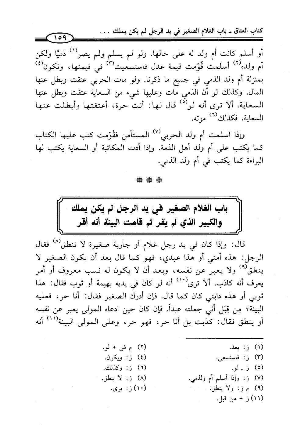 قال: وإذا كان في يد رجل غلام أو جارية صغيرة لا تنطق (¬8) فقال الرجل: هذه أمتي أو هذا عبدي، فهو كما قال بعد أن يكون الصغير لا ينطق (¬9) ولا يعبر عن نفسه، وبعد أن لا يكون له نسب معروف أو أمر يعرف أنه كاذب. ألا ترى (¬10) أنه لو كان في يديه بهيمة أو ثوب فقال: هذا ثوبي أو هذه دابتي كان كما قال. فإن أدرك الصغير فقال: أنا حر، فعليه البينة؛ مِن قِبَل أني جعلته عبداً. فإن كان حين ادعاه المولى يعبر عن نفسه أو ينطق فقال: كذبت بل أنا حر، فهو حر، وعلى المولى البينة (¬11) أنه