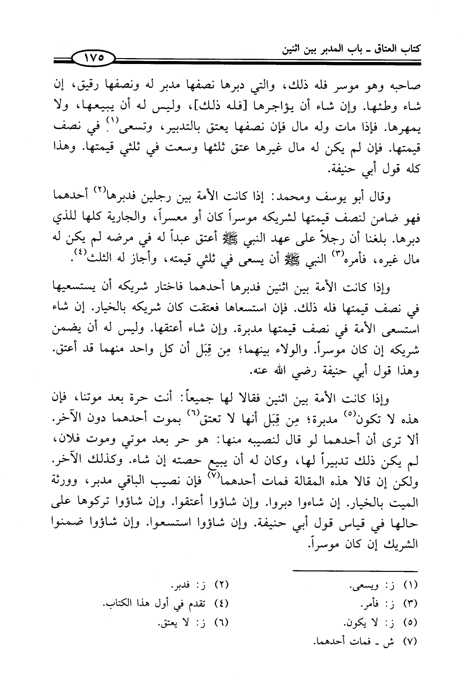 وإذا كانت الأمة بين اثنين فقالا لها جميعاً: أنت حرة بعد موتنا، فإن هذه لا تكون (¬5) مدبرة؛ مِن قِبَل أنها لا تعتق (¬6) بموت أحدهما دون الآخر. ألا ترى أن أحدهما لو قال لنصيبه منها: هو حر بعد موتي وموت فلان، لم يكن ذلك تدبيراً لها، وكان له أن يبيع حصته إن شاء. وكذلك الآخر. ولكن إن قالا هذه المقالة فمات أحدهما (¬7) فإن نصيب الباقي مدبر، وورثة الميت بالخيار. إن شاءوا دبروا. وإن شاؤوا أعتقوا. وإن شاؤوا تركوها على حالها في قياس قول أبي حنيفة. وإن شاؤوا استسعوا. وإن شاؤوا ضمنوا الشريك إن كان موسراً.