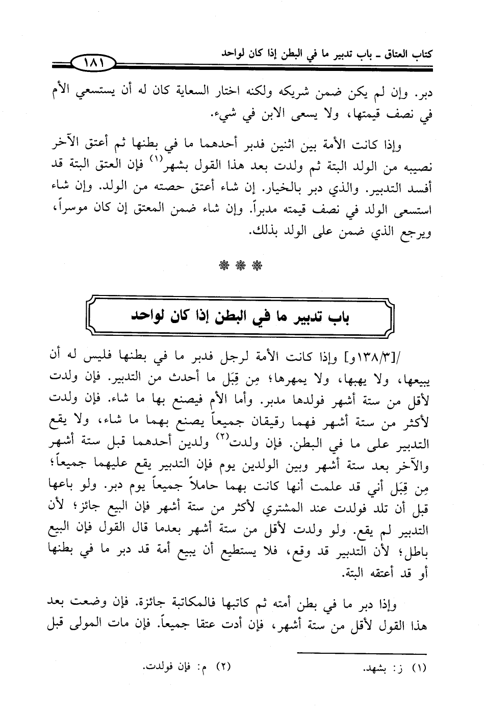 وإذا كانت الأمة لرجل فدبر ما في بطنها فليس له أن يبيعها، ولا يهبها، ولا يمهرها؛ مِن قِبَل ما أحدث من التدبير. فإن ولدت لأقل من ستة أشهر فولدها مدبر. وأما الأم فيصنع بها ما شاء. فإن ولدت لأكثر من ستة أشهر فهما رقيقان جميعاً يصنع بهما ما شاء، ولا يقع التدبير على ما في البطن. فإن ولدت (¬2) ولدين أحدهما قبل ستة أشهر والآخر بعد ستة أشهر وبين الولدين يوم فإن التدبير يقع عليهما جميعاً؛ مِن قِبَل أني قد علمت أنها كانت بهما حاملاً جميعاً يوم دبر. ولو باعها