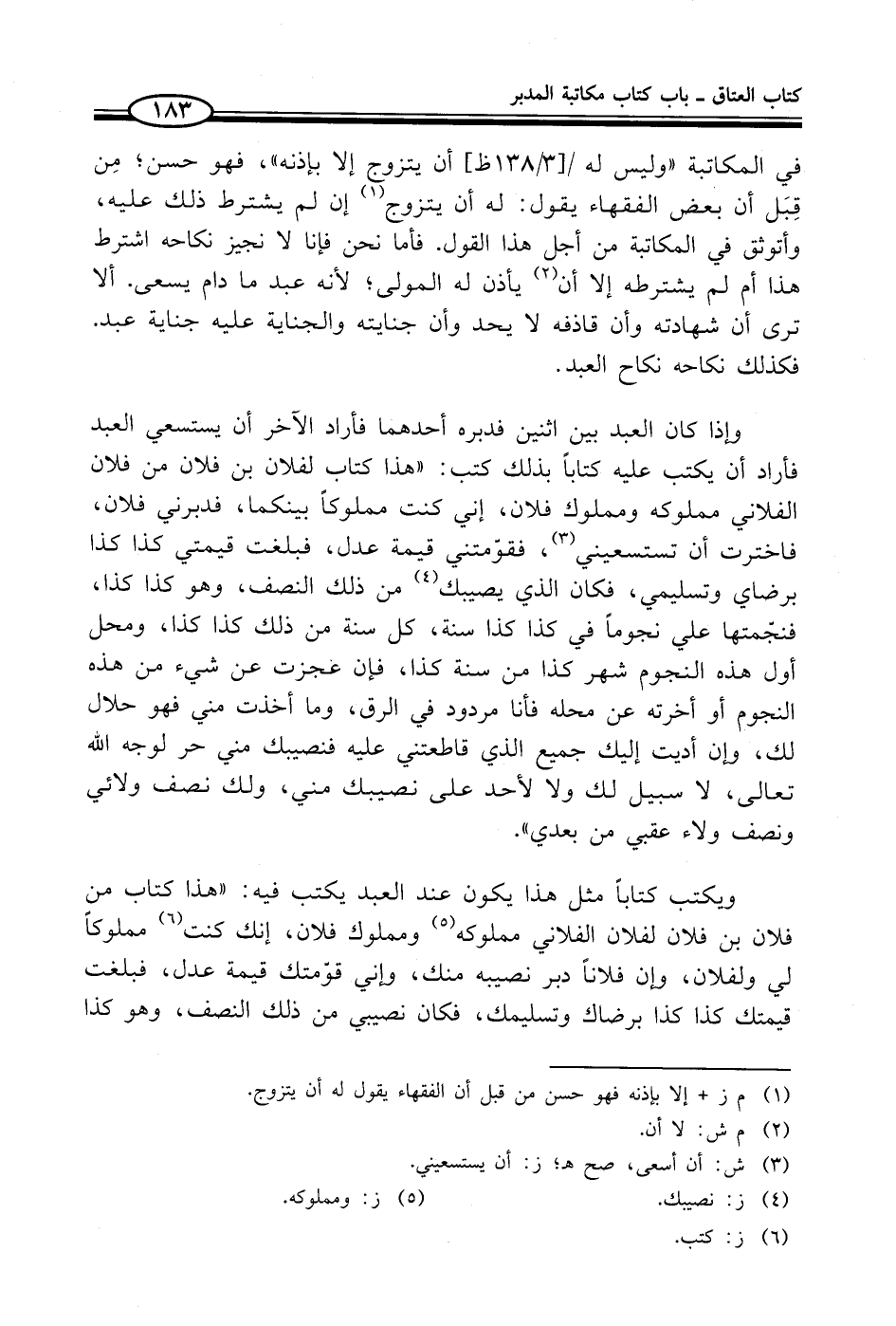 ويكتب كتاباً مثل هذا يكون عند العبد يكتب فيه: "هذا كتاب من فلان بن فلان لفلان الفلاني مملوكه (¬5) ومملوك فلان، إنك كنت (¬6) مملوكاً لي ولفلان، وإن فلاناً دبر نصيبه منك، وإني قوّمتك قيمة عدل، فبلغت قيمتك كذا كذا برضاك وتسليمك، فكان نصيبي من ذلك النصف، وهو كذا