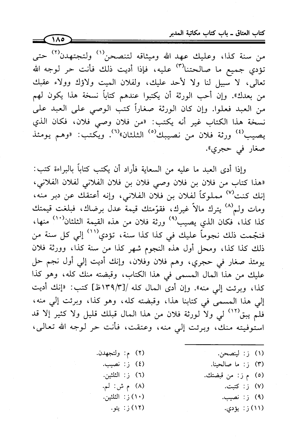 من سنة كذا، وعليك عهد الله وميثاقه لتنصحن (¬1) ولتجتهدن (¬2) حتى تؤدي جميع ما صالحتنا (¬3) عليه، فإذا أديت ذلك فأنت حر لوجه الله تعالى، لا سبيل لنا ولا لأحد عليك، ولفلان الميت ولاؤك وولاء عقبك من بعدك". وإن أحب الورثة أن يكتبوا عندهم كتاباً نسخة هذا يكون لهم من العبد فعلوا. وإن كان الورثة صغارًا كتب الوصي على العبد على نسخة هذا الكتاب غير أنه يكتب: "من فلان وصي فلان، فكان الذي يصيب (¬4) ورثة فلان من نصيبك (¬5) الثلثان" (¬6). ويكتب: "وهم يومئذ صغار في حجري".