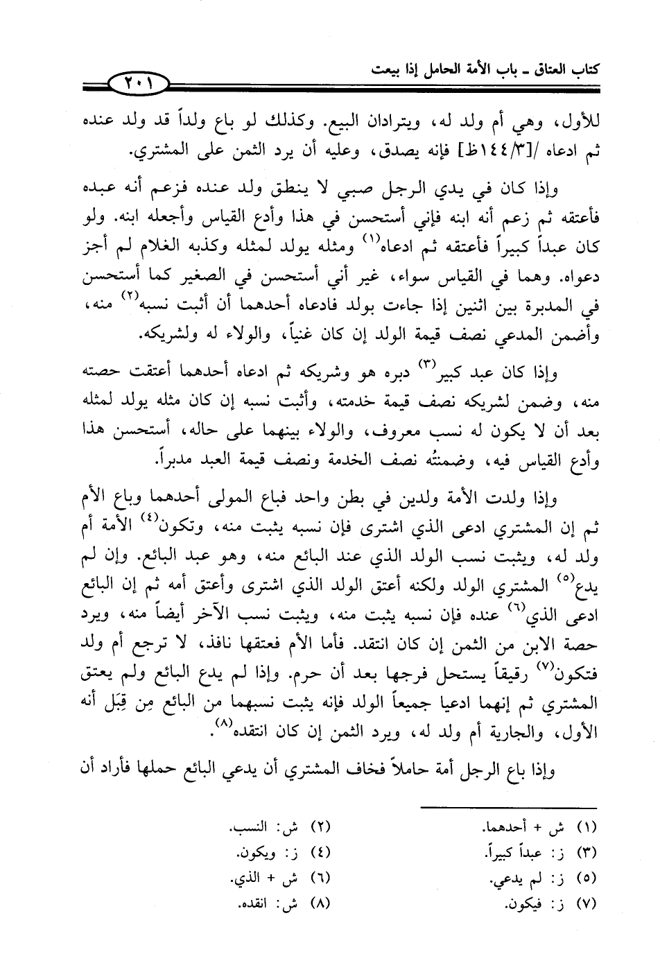 وإذا ولدت الأمة ولدين في بطن واحد فباع المولى أحدهما وباع الأم ثم إن المشتري ادعى الذي اشترى فإن نسبه يثبت منه، وتكون (¬4) الأمة أم ولد له، ويثبت نسب الولد الذي عند البائع منه، وهو عبد البائع. وإن لم يدع (¬5) المشتري الولد ولكنه أعتق الولد الذي اشترى وأعتق أمه ثم إن البائع ادعى الذي (¬6) عنده فإن نسبه يثبت منه، ويثبت نسب الآخر أيضاً منه، ويرد حصة الابن من الثمن إن كان انتقد. فأما الأم فعتقها نافذ، لا ترجع أم ولد فتكون (¬7) رقيقاً يستحل فرجها بعد أن حرم. وإذا لم يدع البائع ولم يعتق المشتري ثم إنهما ادعيا جميعاً الولد فإنه يثبت نسبهما من البائع مِن قِبَل أنه الأول، والجارية أم ولد له، ويرد الثمن إن كان انتقده (¬8).