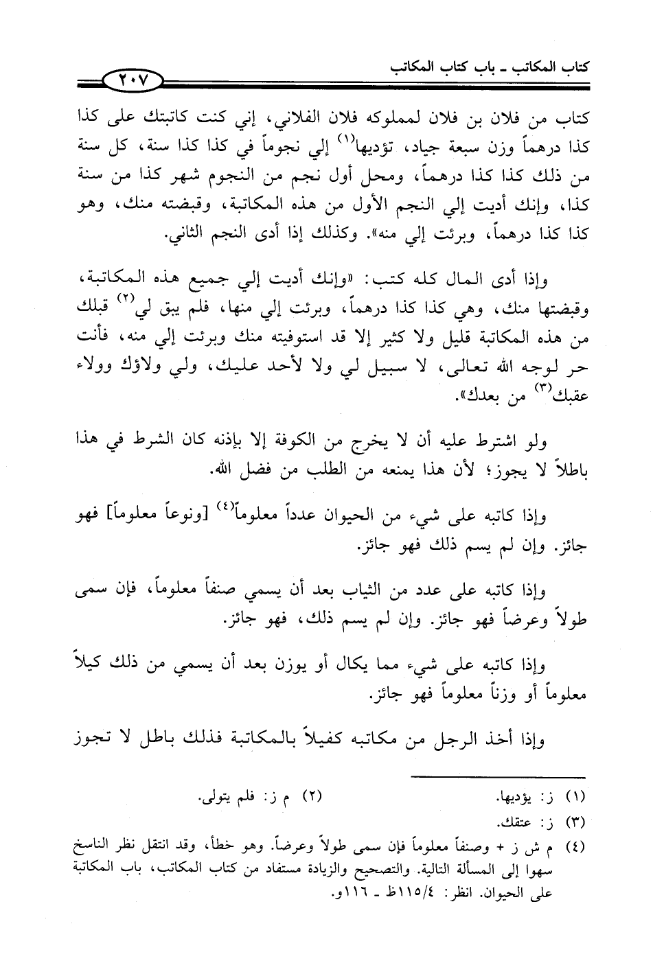 (¬4) م ش ز + وصنفاً معلوماً فإن سمى طولاً وعرضاً. وهو خطأ، وقد انتقل نظر الناسخ سهوا إلى المسألة التالية. والتصحيح والزيادة مستفاد من كتاب المكاتب، باب المكاتبة على الحيوان. انظر: 4/ 115 ظ - 116 و.