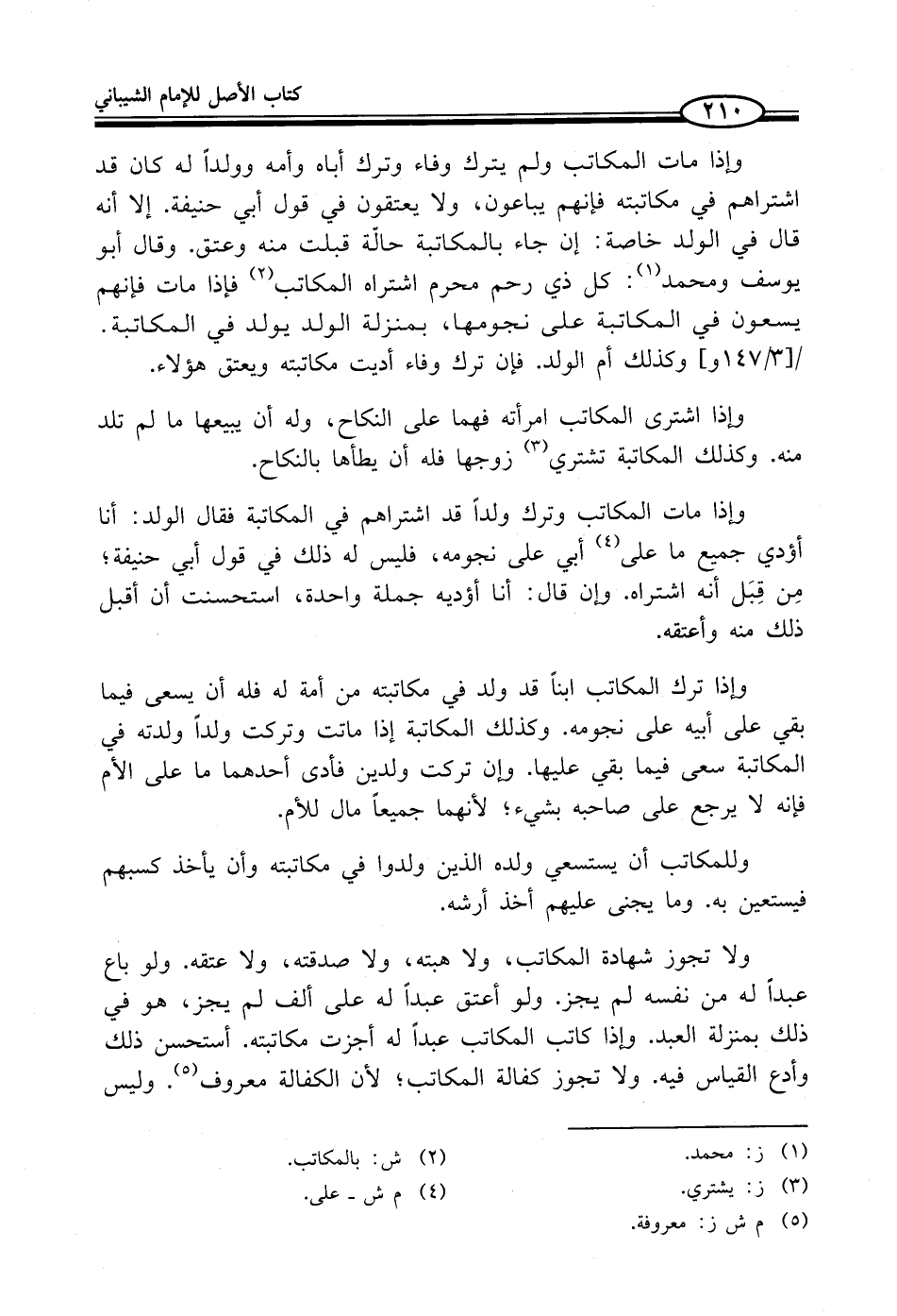وإذا مات المكاتب ولم يترك وفاء وترك أباه وأمه وولداً له كان قد اشتراهم في مكاتبته فإنهم يباعون، ولا يعتقون في قول أبي حنيفة. إلا أنه قال في الولد خاصة: إن جاء بالمكاتبة حالة قبلت منه وعتق. وقال أبو يوسف ومحمد (¬1): كل ذي رحم محرم اشتراه المكاتب (¬2) فإذا مات فإنهم يسعون في المكاتبة على نجومها، بمنزلة الولد يولد في المكاتبة. وكذلك أم الولد. فإن ترك وفاء أديت مكاتبته ويعتق هؤلاء.