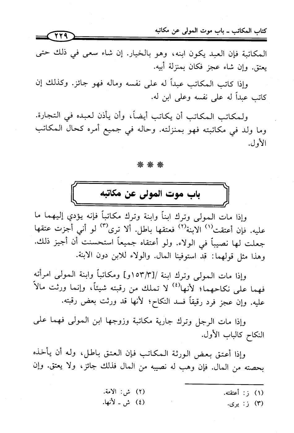وإذا مات المولى وترك ابنة ومكاتباً وابنة المولى امرأته فهما على نكاحهما؛ لأنها (¬4) لا تملك من رقبته شيئاً، وإنما ورثت مالاً عليه. وإن عجز فرد رقيقاً فسد النكاح؛ لأنها قد ورثت بعض رقبته. وإذا مات الرجل وترك جارية مكاتبة وزوجها ابن المولى فهما على النكاح كالباب الأول.