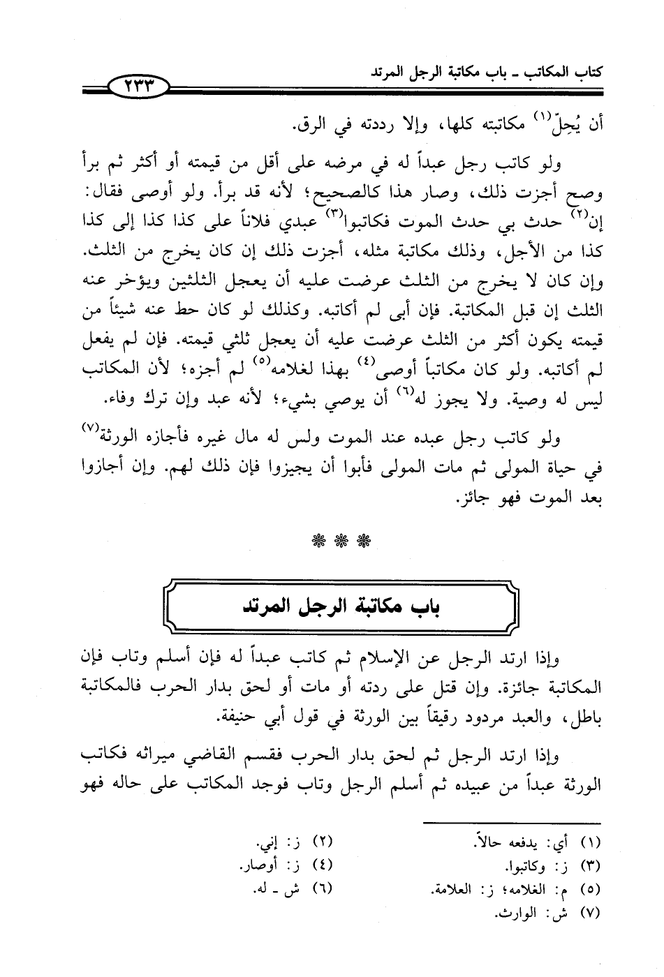 وإذا ارتد الرجل عن الإسلام ثم كاتب عبداً له فإن أسلم وتاب فإن المكاتبة جائزة. وإن قتل على ردته أو مات أو لحق بدار الحرب فالمكاتبة باطل، والعبد مردود رقيقاً بين الورثة في قول أبي حنيفة.