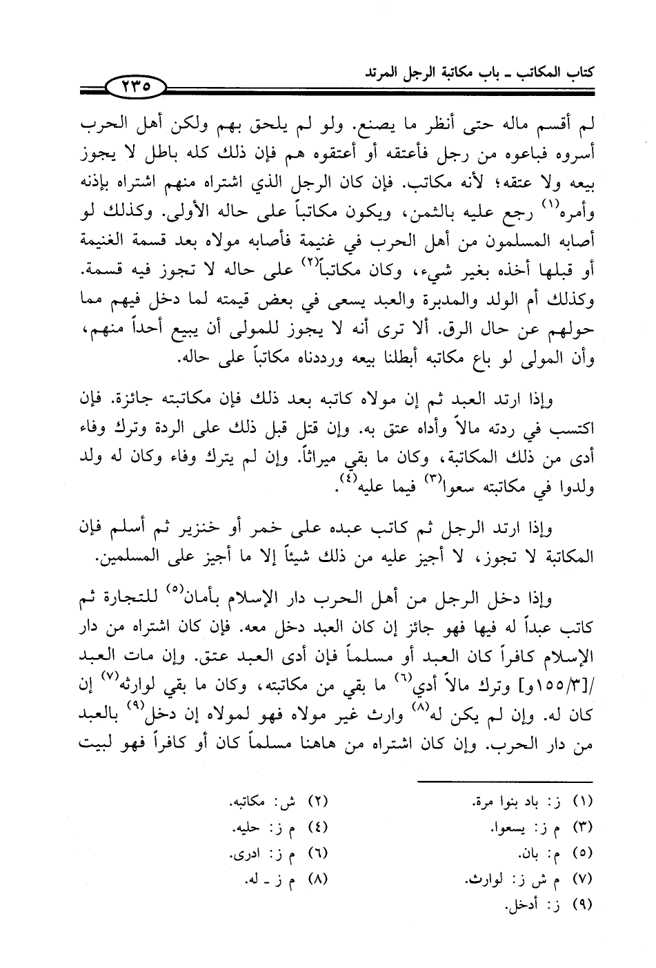 لم أقسم ماله حتى أنظر ما يصنع. ولو لم يلحق بهم ولكن أهل الحرب أسروه فباعوه من رجل فأعتقه أو أعتقوه هم فإن ذلك كله باطل لا يجوز بيعه ولا عتقه؛ لأنه مكاتب. فإن كان الرجل الذي اشتراه منهم اشتراه بإذنه وأمره (¬1) رجع عليه بالثمن، ويكون مكاتباً على حاله الأولى. وكذلك لو أصابه المسلمون من أهل الحرب في غنيمة فأصابه مولاه بعد قسمة الغنيمة أو قبلها أخذه بغير شيء، وكان مكاتباً (¬2) على حاله لا تجوز فيه قسمة. وكذلك أم الولد والمدبرة والعبد يسعى في بعض قيمته لما دخل فيهم مما حولهم عن حال الرق. ألا ترى أنه لا يجوز للمولى أن يبيع أحداً منهم، وأن المولى لو باع مكاتبه أبطلنا بيعه ورددناه مكاتباً على حاله.