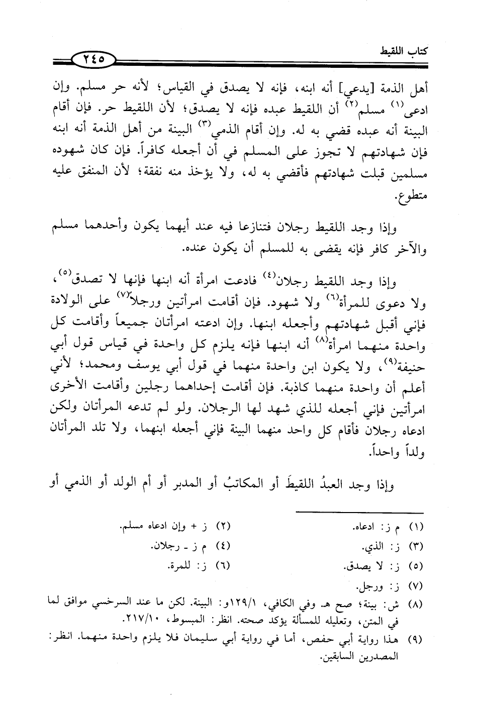 أهل الذمة [يدعي] أنه ابنه، فإنه لا يصدق في القياس؛ لأنه حر مسلم. وإن ادعى (¬1) مسلم (¬2) أن اللقيط عبده فإنه لا يصدق؛ لأن اللقيط حر. فإن أقام البينة أنه عبده قضي به له. وإن أقام الذمي (¬3) البينة من أهل الذمة أنه ابنه فإن شهادتهم لا تجوز على المسلم في أن أجعله كافراً. فإن كان شهوده مسلمين قبلت شهادتهم فأقضي به له، ولا يؤخذ منه نفقة؛ لأن المنفق عليه متطوع.