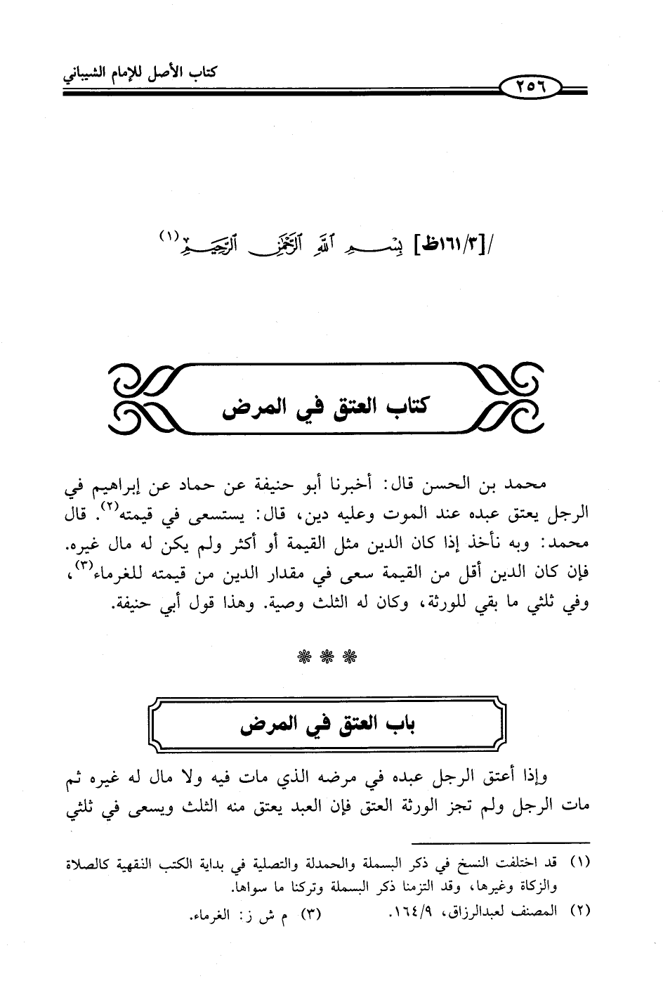 محمد بن الحسن قال: أخبرنا أبو حنيفة عن حماد عن إبراهيم في الرجل يعتق عبده عند الموت وعليه دين، قال: يستسعى في قيمته (¬2). قال محمد: وبه نأخذ إذا كان الدين مثل القيمة أو أكثر ولم يكن له مال غيره. فإن كان الدين أقل من القيمة سعى في مقدار الدين من قيمته للغرماء (¬3)، وفي ثلثي ما بقي للورثة، وكان له الثلث وصية. وهذا قول أبي حنيفة.