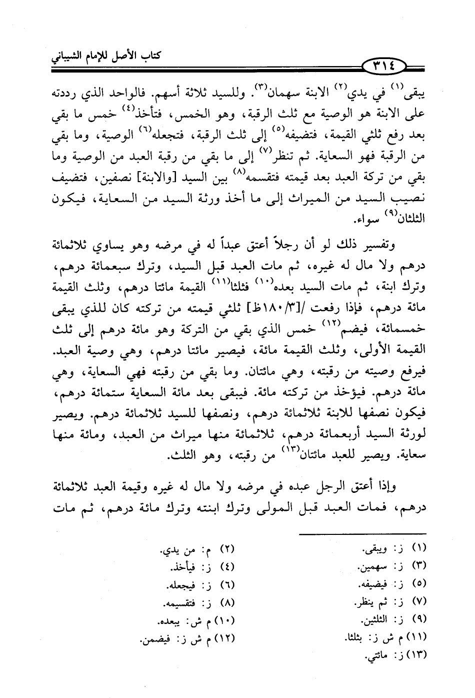 وتفسير ذلك لو أن رجلاً أعتق عبداً له في مرضه وهو يساوي ثلاثمائة درهم ولا مال له غيره، ثم مات العبد قبل السيد، وترك سبعمائة درهم، وترك ابنة، ثم مات السيد بعده (¬10) فثلثا (¬11) القيمة مائتا درهم، وثلث القيمة مائة درهم، فإذا رفعت ثلثي قيمته من تركته كان للذي يبقى خمسمائة، فيضم (¬12) خمس الذي بقي من التركة وهو مائة درهم إلى ثلث القيمة الأولى، وثلث القيمة مائة، فيصير مائتا درهم، وهي وصية العبد. فيرفع وصيته من رقبته، وهي مائتان. وما بقي من رقبته فهي السعاية، وهي مائة درهم. فيؤخذ من تركته مائة. فيبقى بعد مائة السعاية ستمائة درهم، فيكون نصفها للابنة ثلاثمائة درهم، ونصفها للسيد ثلاثمائة درهم. ويصير لورثة السيد أربعمائة درهم، ثلاثمائة منها ميراث من العبد، ومائة منها سعاية. ويصير للعبد مائتان (¬13) من رقبته، وهو الثلث.