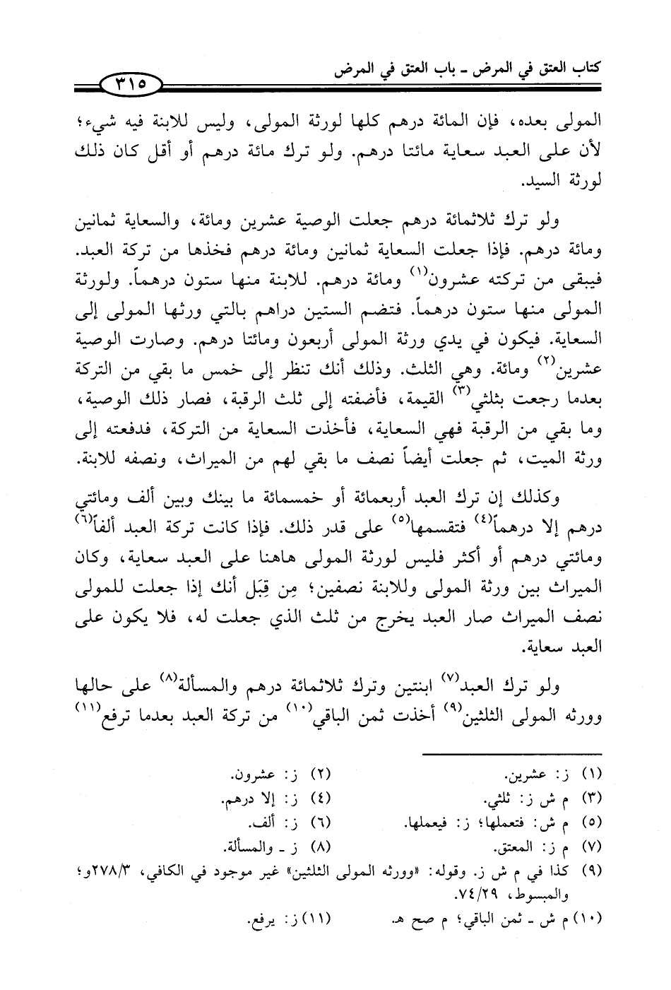 (¬9) كذا في م ش ز. وقوله: "وورثه المولى الثلثين" غير موجود في الكافي، 3/ 278 و؛ والمبسوط، 29/ 74.