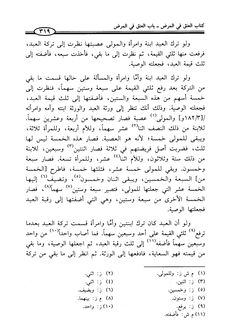 ولو ترك العبد ابنة وأمًّا وامرأة والمسألة على حالها قسمت ما بقي من التركة بعد رفع ثلثي القيمة على سبعة وستين سهماً، فنظرت إلى خمسة أسهم من هذه السبعة والستين، فأضفتها إلى ثلث قيمة العبد، فجعلته الوصية. وذلك أنك تنظر إلى ورثة العبد والورثة ابنته وأمه وامرأته والمولى (¬1) عصبة فصار تصحيحها من أربعة وعشرين سهماً. للابنة من ذلك النصف اثنا (¬2) عشر سهماً، وللأم أربعة، وللمرأة ثلاثة، ويبقى للمولى خمسة؛ لأنه هو العصبة. فصار هذه الخمسة ليس لها ثلث، فضربت أصل فريضتهم في ثلاثة فصار اثنتين (¬3) وسبعين، للابنة من ذلك ستة وثلاثون، وللأم اثنا (¬4) عشر، وللمرأة تسعة. فصار سبعة وخمسون. وبقي للمولى خمسة عشر، فثلثها خمسة، فاطرح [الخمسة من] السبعة والخمسين، ويبقى اثنان وخمسون (¬5)، وتضيف (¬6) إليها الخمسة عشر التي جعلتها للمولى، فتصير سبعة وستين (¬7) سهماً (¬8)، فصار الخمسة الأخرى من سبعة وستين، وهي التي أضفتها إلى رقبة العبد فجعلتها الوصية.