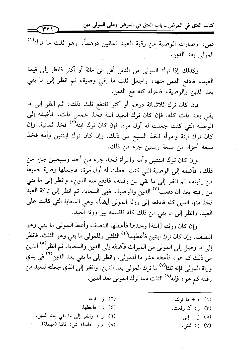 وإن كان ترك ابنتين وأمه وامرأة فخذ جزء من أحد وسبعين جزء من ذلك، فأضفه إلى الوصية التي كنت جعلت له أول مرة، فاجعلها وصية جميعاً من رقبته، ثم انظر إلى ما بقي من رقبته، فادفع منه الدين، وانظر إلى ما بقي من رقبته بعد أن دفعت (¬3) الدين والوصية، فهي السعابة. ثم انظر إلى تركة العبد فخذ منها الدين كله فادفعه إلى ورثة المولى أيضاً، وهي السعاية التي كانت على العبد. وانظر إلى ما بقي من ذلك كله فاقسمه بين ورثة العبد.