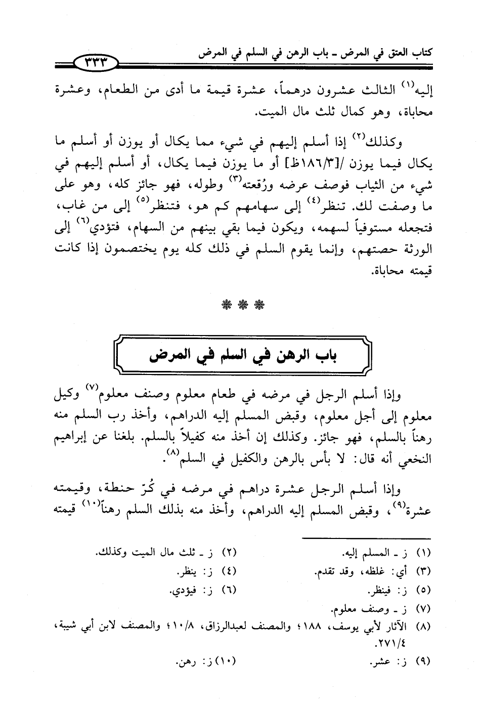 وإذا أسلم الرجل في مرضه في طعام معلوم وصنف معلوم (¬7) وكيل معلوم إلى أجل معلوم، وقبض المسلم إليه الدراهم، وأخذ رب السلم منه رهناً بالسلم، فهو جائز. وكذلك إن أخذ منه كفيلاً بالسلم. بلغنا عن إبراهيم النخعي أنه قال: لا بأس بالرهن والكفيل في السلم (¬8).