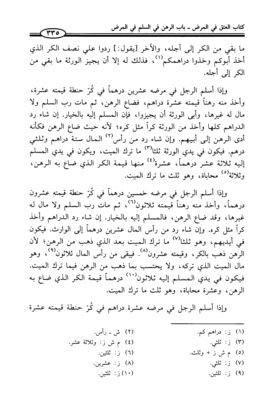 وإذا أسلم الرجل في مرضه عشرين درهماً في كُرّ حنطة قيمته عشرة، وأخذ منه رهناً قيمته عشرة دراهم، فضاع الرهن، ثم مات رب السلم ولا مال له غيرها، وأبى الورثة أن يجيزوا، فإن المسلم إليه بالخيار. إن شاء رد الدراهم كلها وأخذ من الورثة كراً مثل كره، لأنه حيث ضاع الرهن فكأنه أدى الرهن إلى أبيهم. وإن شاء رد من رأس (¬2) المال ستة دراهم وثلثي درهم. فيكون في يدي الورثة ثلثا (¬3) ما ترك الميت، ويكون في يدي المسلم إليه ثلاثة عشر درهماً، عشرة (¬4) منها قيمة الكر الذي ضاع به الرهن، وثلاثة (¬5) محاباة، وهو ثلث ما ترك الميت.