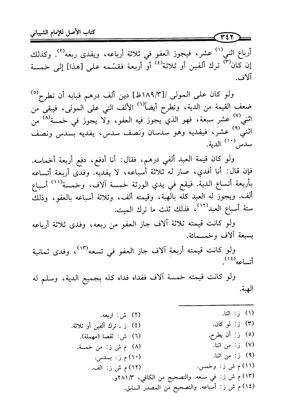 أرباع اثني (¬1) عشر، فيجوز العفو في ثلاثة أرباعه، ويفدى ربعه (¬2). وكذلك إن كان (¬3) ترك ألفين أو ثلاثة (¬4) أو أربعة فقسّمه على [هذا] إلى خمسة آلاف.