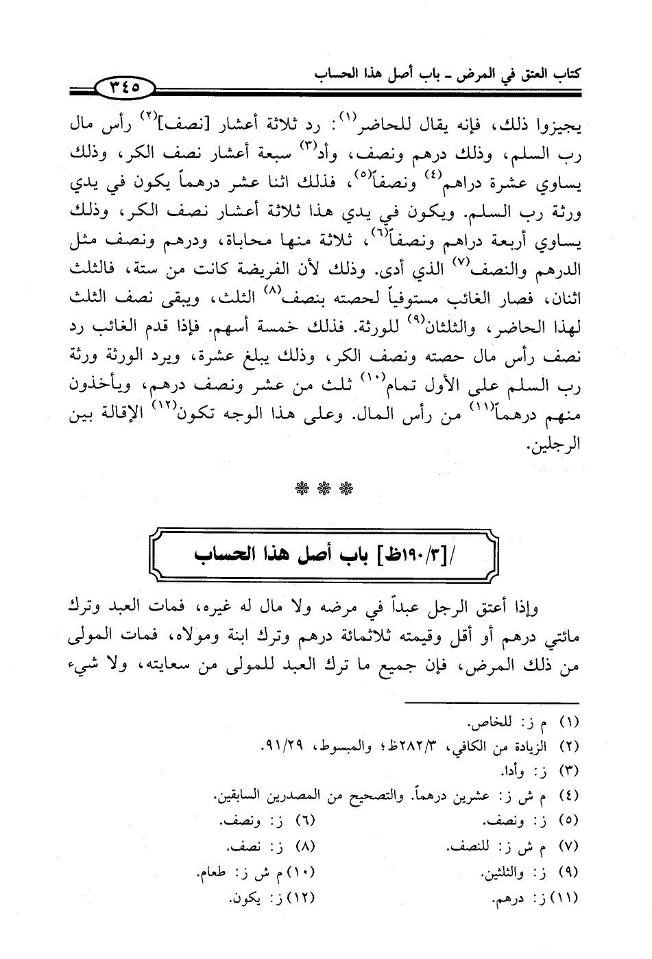 يجيزوا ذلك، فإنه يقال للحاضر (¬1): رد ثلاثة أعشار [نصف] (¬2) رأس مال رب السلم، وذلك درهم ونصف، وأد (¬3) سبعة أعشار نصف الكر، وذلك يساوي عشرة دراهم (¬4) ونصفاً (¬5)، فذلك اثنا عشر درهماً يكون في يدي ورثة رب السلم. ويكون في يدي هذا ثلاثة أعشار نصف الكر، وذلك يساوي أربعة دراهم ونصفاً (¬6)، ثلاثة منها محاباة، ودرهم ونصف مثل الدرهم والنصف (¬7) الذي أدى. وذلك لأن الفريضة كانت من ستة، فالثلث اثنان، فصار الغائب مستوفياً لحصته بنصف (¬8) الثلث، ويبقى نصف الثلث لهذا الحاضر، والثلثان (¬9) للورثة. فذلك خمسة أسهم. فإذا قدم الغائب رد نصف رأس مال حصته ونصف الكر، وذلك يبلغ عشرة، ويرد الورثة ورثة رب السلم على الأول تمام (¬10) ثلث من عشر ونصف درهم، ويأخذون منهم درهماً (¬11) من رأس المال. وعلى هذا الوجه تكون (¬12) الإقالة بين الرجلين.