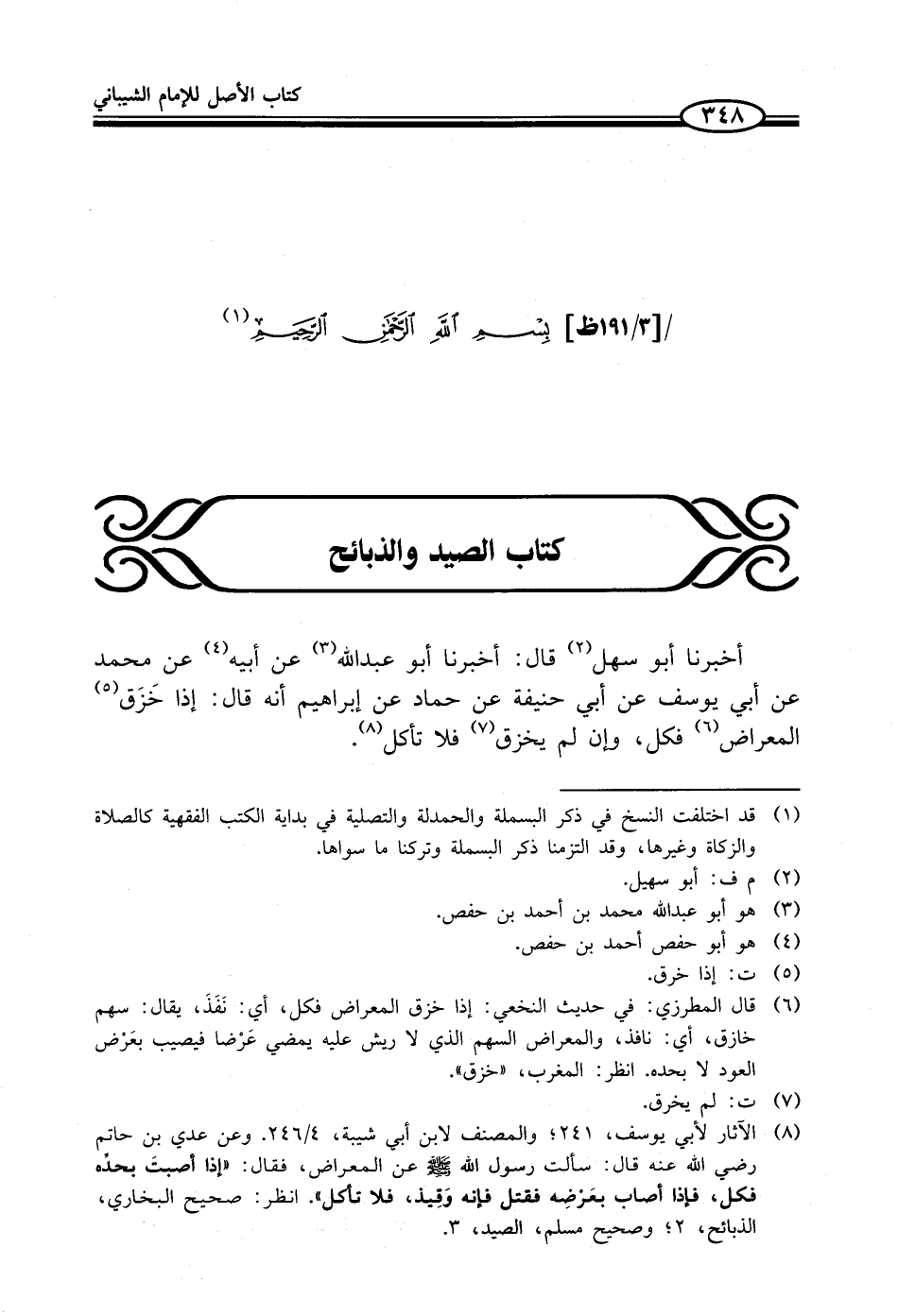 (¬8) الآثار لأبي يوسف، 241؛ والمصنف لابن أبي شيبة، 4/ 246. وعن عدي بن حاتم - رضي الله عنه - قال: سألت رسول الله - صلى الله عليه وسلم - عن المعراض، فقال: "إذا أصبتَ بحدِّه فكل، فإذا أصاب بعَرْضِه ققتل فإنه وَقِيذ، فلا تأكل". انظر: صحيح البخاري، الذبائح، 2؛ وصحيح مسلم، الصيد، 3.