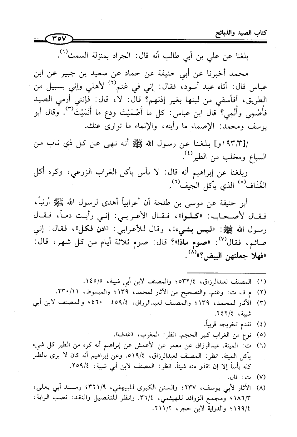 (¬8) الآثار لأبي يوسف، 237؛ والسنن الكبرى للبيهقي، 9/ 321؛ ومسند أبي يعلى، 3/ 186؛ ومجمع الزوائد للهيثمي، 4/ 36. وانظر للتفصيل والنقد: نصب الراية، 4/ 199؛ والدراية لابن حجر، 2/ 211.