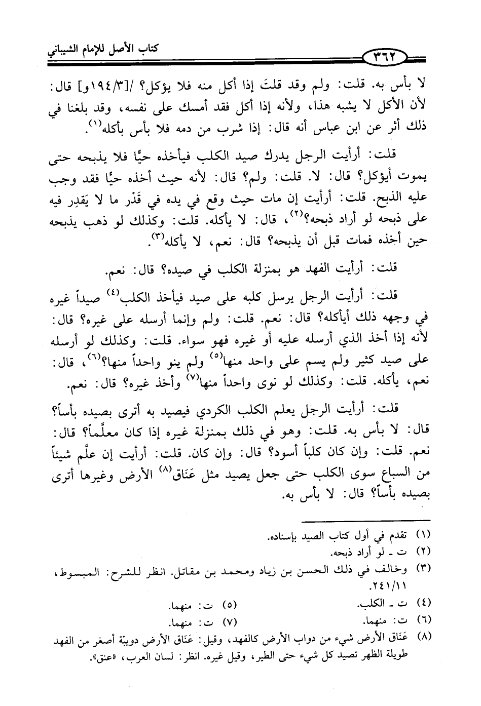 قلت: أرأيت الرجل يعلم الكلب الكردي فيصيد به أترى بصيده بأساً؟ قال: لا بأس به. قلت: وهو في ذلك بمنزلة غيره إذا كان معلَّماً؟ قال: نعم. قلت: وإن كان كلباً أسود؟ قال: وإن كان. قلت: أرأيت إن علَّم شيئاً من السباع سوى الكلب حتى جعل يصيد مثل عَنَاق (¬8) الأرض وغيرها أترى بصيده بأساً؟ قال: لا بأس به.
