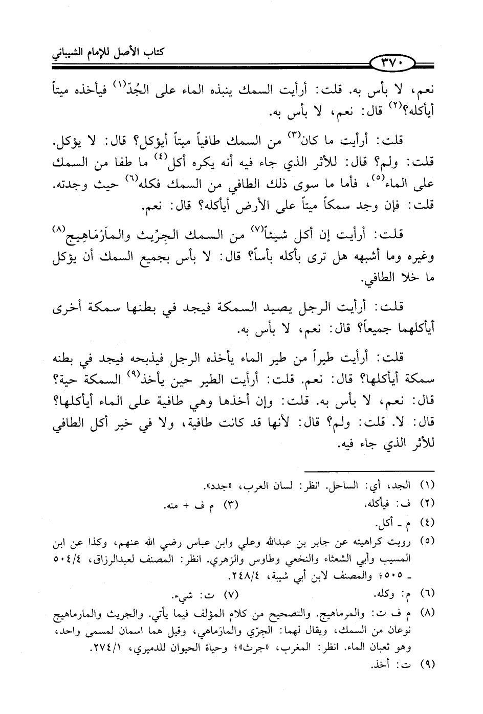 نعم، لا بأس به. قلت: أرأيت السمك ينبذه الماء على الجُدّ (¬1) فيأخذه ميتاً أيأكله؟ (¬2) قال: نعم، لا بأس به.
