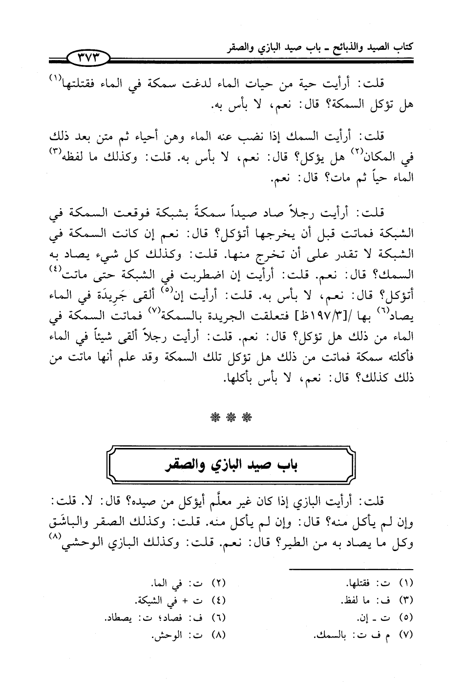 قلت: أرأيت السمك إذا نضب عنه الماء وهن أحياء ثم متن بعد ذلك في المكان (¬2) هل يؤكل؟ قال: نعم، لا بأس به. قلت: وكذلك ما لفظه (¬3) الماء حياً ثم مات؟ قال: نعم.