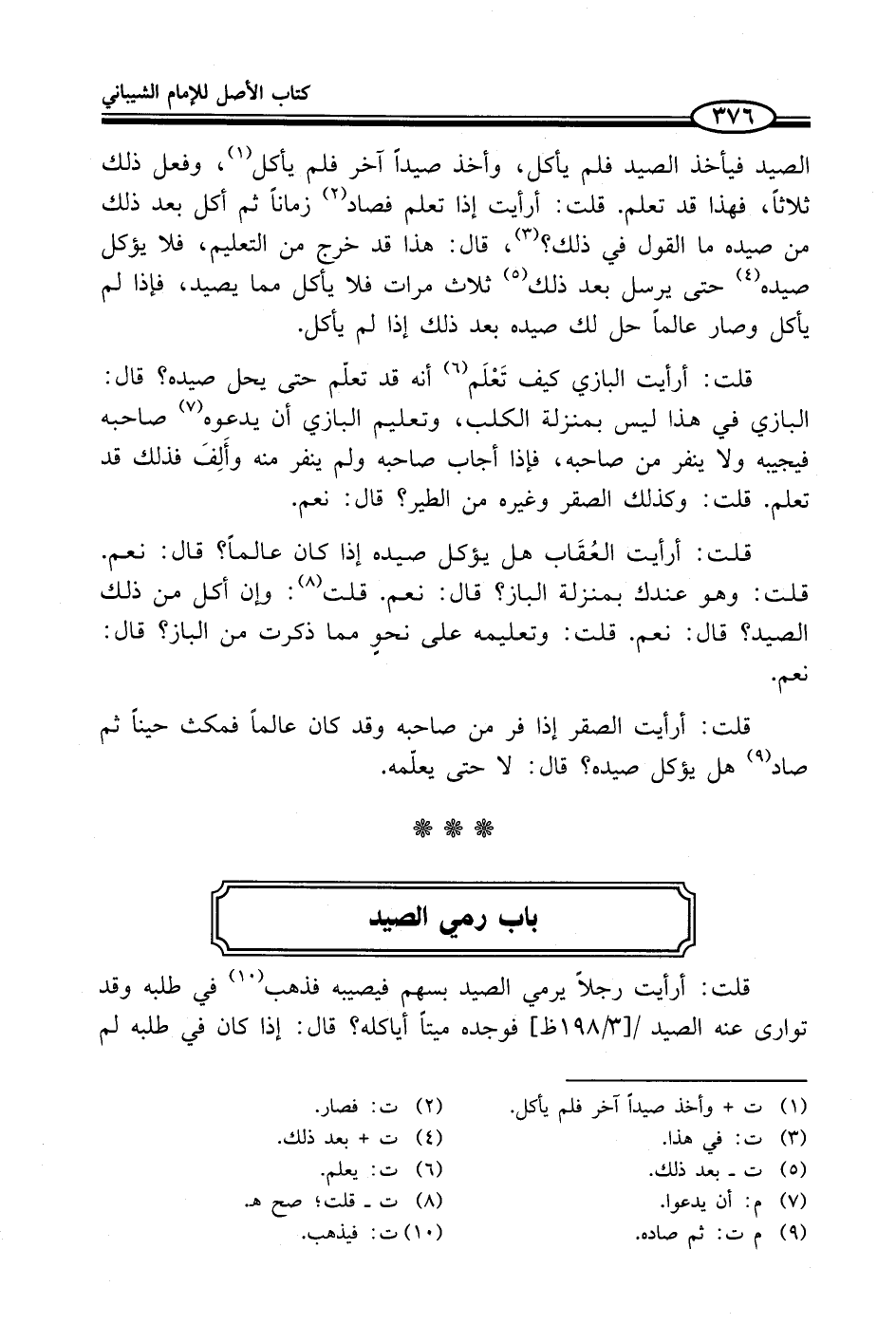 قلت: أرأيت العُقَاب هل يؤكل صيده إذا كان عالماً؟ قال: نعم. قلت: وهو عندك بمنزلة الباز؟ قال: نعم. قلت (¬8): وإن أكل من ذلك الصيد؟ قال: نعم. قلت: وتعليمه على نحو مما ذكرت من الباز؟ قال: نعم.