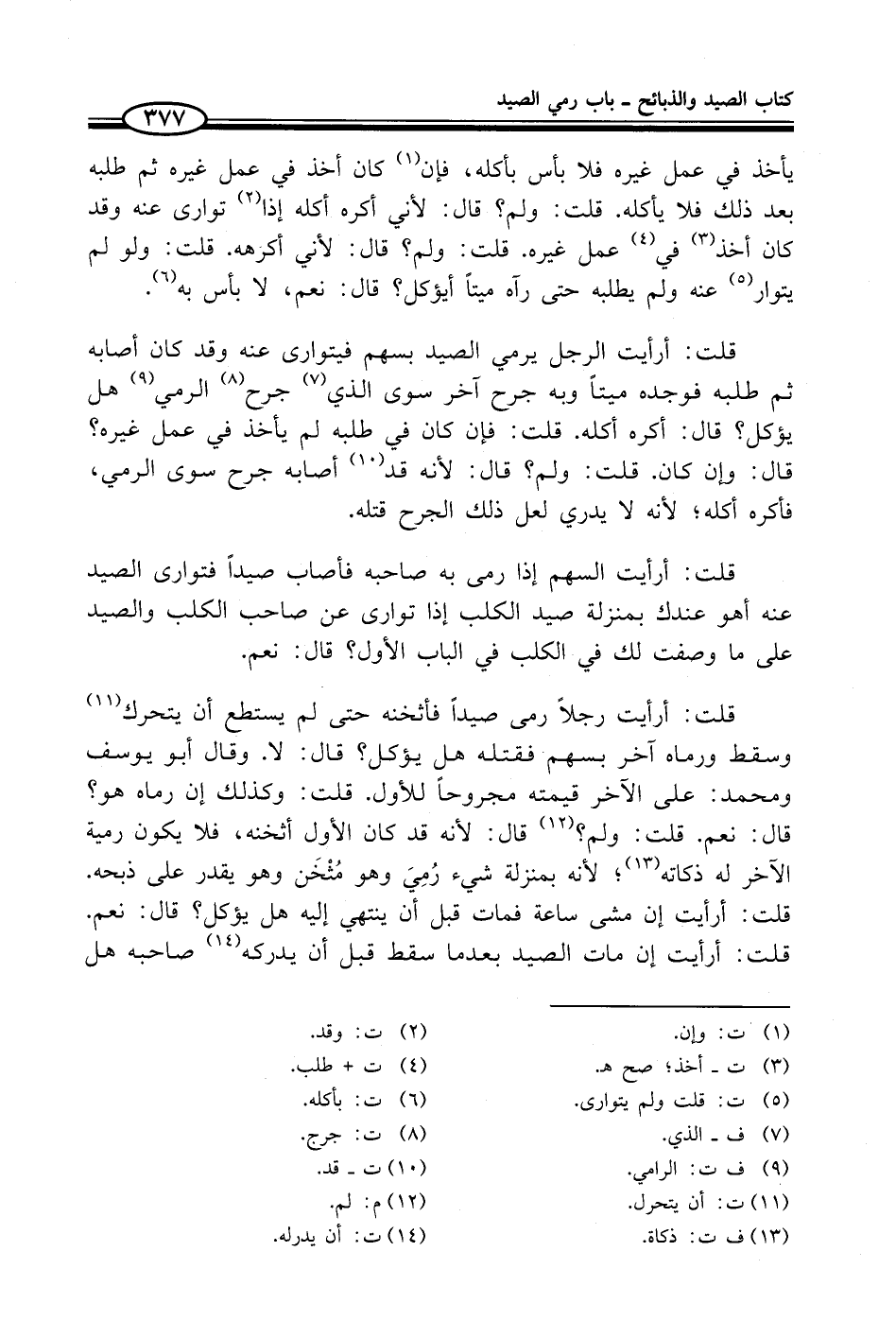 قلت: أرأيت رجلاً رمى صيداً فأثخنه حتى لم يستطع أن يتحرك (¬11) وسقط ورماه آخر بسهم فقتله هل يؤكل؟ قال: لا. وقال أبو يوسف ومحمد: على الآخر قيمته مجروحاً للأول. قلت: وكذلك إن رماه هو؟ قال: نعم. قلت: ولم؟ (¬12) قال: لأنه قد كان الأول أثخنه، فلا يكون رمية الآخر له ذكاته (¬13)؛ لأنه بمنزلة شيء رُمِيَ وهو مُثْخَن وهو يقدر على ذبحه. قلت: أرأيت إن مشى ساعة فمات قبل أن ينتهي إليه هل يؤكل؟ قال: نعم. قلت: أرأيت إن مات الصيد بعدما سقط قبل أن يدركه (¬14) صاحبه هل