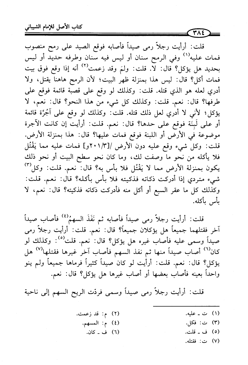 قلت: أرأيت رجلاً رمى صيداً وسمى فردّت الريح السهم إلى ناحية