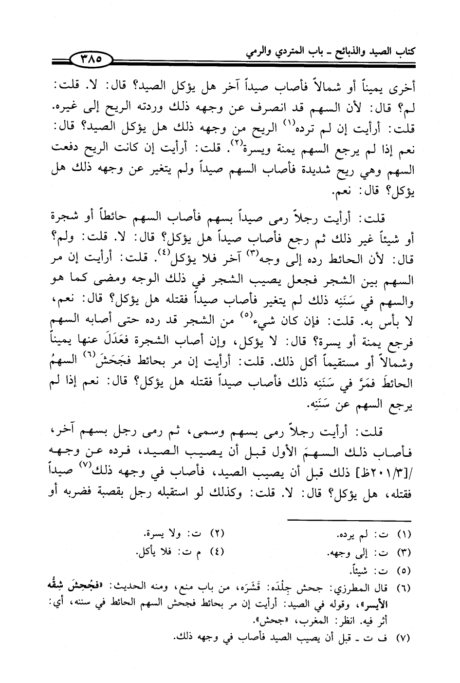 قلت: أرأيمت رجلاً رمى صيداً بسهم فأصاب السهم حائطاً أو شجرة أو شيئاً غير ذلك ثم رجع فأصاب صيداً هل يؤكل؟ قال: لا. قلت: ولم؟ قال: لأن الحائط رده إلى وجه (¬3) آخر فلا يؤكل (¬4). قلت: أرأيت إن مر السهم بين الشجر فجعل يصيب الشجر في ذلك الوجه ومضى كما هو والسهم في سَنَنِه ذلك لم يتغير فأصاب صيداً فقتله هل يؤكل؟ قال: نعم، لا بأس به. قلت: فإن كان شيء (¬5) من الشجر قد رده حتى أصابه السهم فرجع يمنة أو يسرة؟ قال: لا يؤكل، وإن أصاب الشجرة فعَدَلَ عنها يميناً وشمالاً أو مستقيماً أكل ذلك. قلت: أرأيت إن مر بحائط فجَحَشَ (¬6) السهمُ الحائطَ فمَرَّ في سَنَنِه ذلك فأصاب صيداً فقتله هل يؤكل؟ قال: نعم إذا لم يرجع السهم عن سَنَنِه.