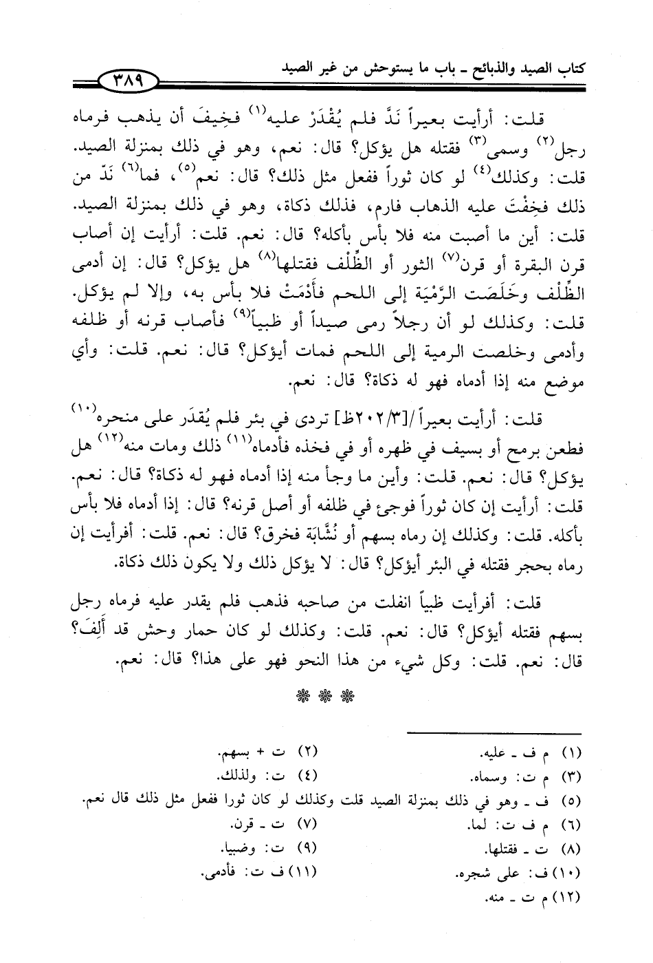 قلت: أفرأيت ظبياً انفلت من صاحبه فذهب فلم يقدر عليه فرماه رجل بسهم فقتله أيؤكل؟ قال: نعم. قلت: وكذلك لو كان حمار وحش قد أَلِفَ؟ قال: نعم. قلت: وكل شيء من هذا النحو فهو على هذا؟ قال: نعم.
