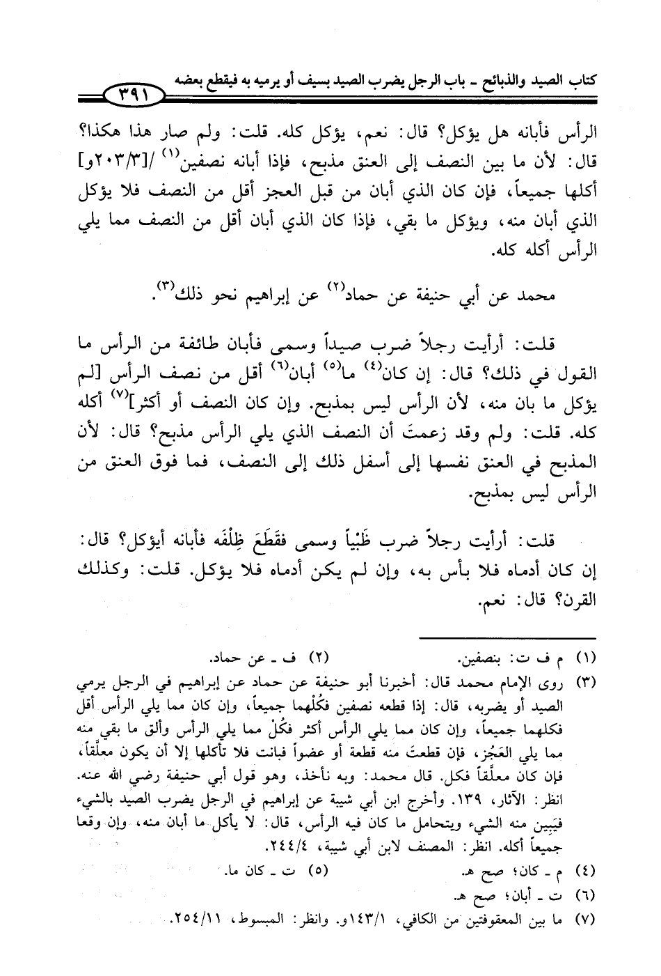 (¬3) روى الإمام محمد قال: أخبرنا أبو حنيفة عن حماد عن إبراهيم في الرجل يرمي الصيد أو يضربه، قال: إذا قطعه نصفين فكُلْهما جميعاً، وإن كان مما يلي الرأس أقل فكلهما جميعاً، وإن كان مما يلي الرأس أكثر فكُلْ مما يلي الرأس وألق ما بقي منه مما يلي العَجُز، فإن قطعتَ منه قطعة أو عضواً فبانت فلا تأكلها إلا أن يكون معلَّقاً، فكان كان معلَّقاً فكل. قال محمد: وبه نأخذ، وهو قول أبي حنيفة - رضي الله عنه -. انظر: الآثار، 139. وأخرج ابن أبي شيبة عن إبراهيم في الرجل يضرب الصيد بالشيء فيَبِين منه الشيء ويتحامل ما كان فيه الرأس، قال: لا يأكل ما أبان منه، وإن وقعا جميعاً أكله. انظر: المصنف لابن أبي شيبة، 4/ 244.